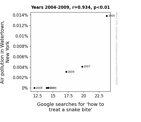 This means 87.2% of the change in the one variable (i.e., Google searches for 'how to treat a snake bite') is predictable based on the change in the other (i.e., Air pollution in Watertown, New York) over the 6 years from 2004 through 2009.