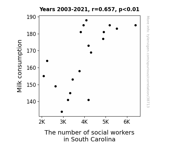 This means 43.1% of the change in the one variable (i.e., The number of social workers in South Carolina) is predictable based on the change in the other (i.e., Milk consumption) over the 19 years from 2003 through 2021.