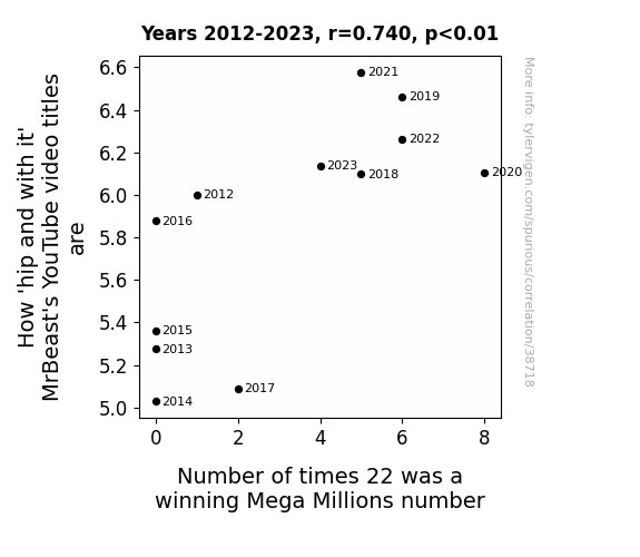 This means 54.8% of the change in the one variable (i.e., Number of times 22 was a winning Mega Millions number) is predictable based on the change in the other (i.e., How 'hip and with it' MrBeast's YouTube video titles are) over the 12 years from 2012 through 2023.