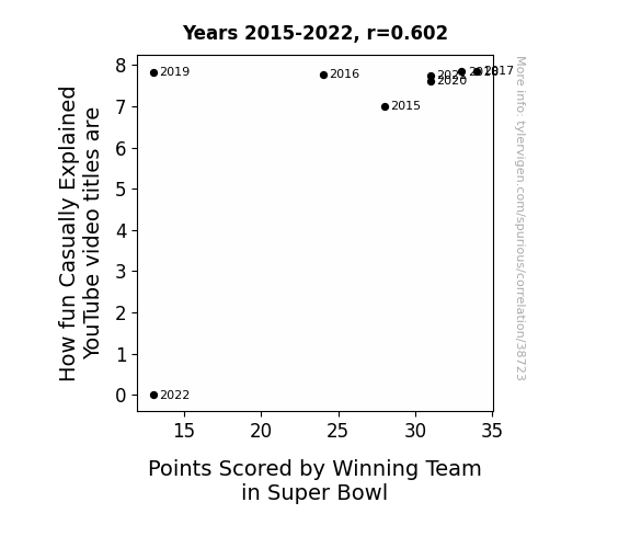 This means 36.3% of the change in the one variable (i.e., Points Scored by Winning Team in Super Bowl) is predictable based on the change in the other (i.e., How fun Casually Explained YouTube video titles are) over the 8 years from 2015 through 2022.