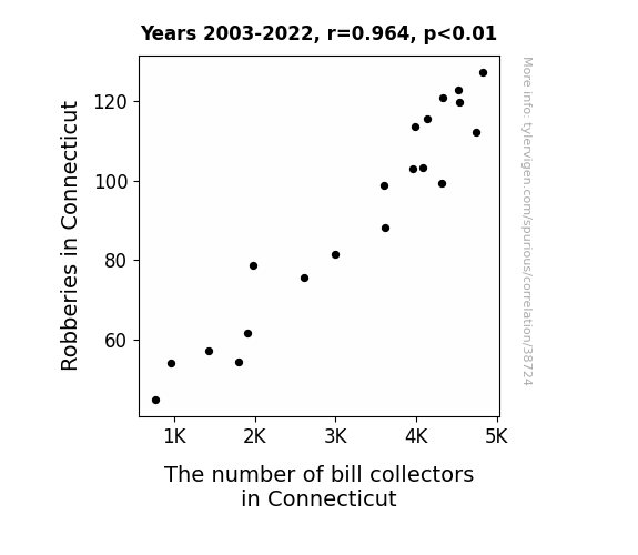 This means 92.9% of the change in the one variable (i.e., The number of bill collectors in Connecticut) is predictable based on the change in the other (i.e., Robberies in Connecticut) over the 20 years from 2003 through 2022.