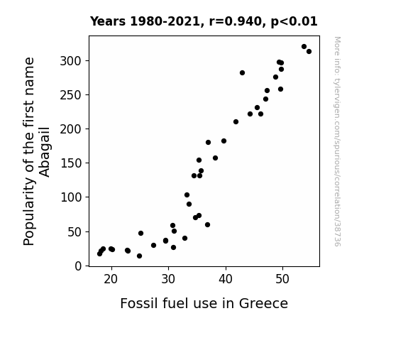 This means 88.4% of the change in the one variable (i.e., Fossil fuel use in Greece) is predictable based on the change in the other (i.e., Popularity of the first name Abagail) over the 42 years from 1980 through 2021.