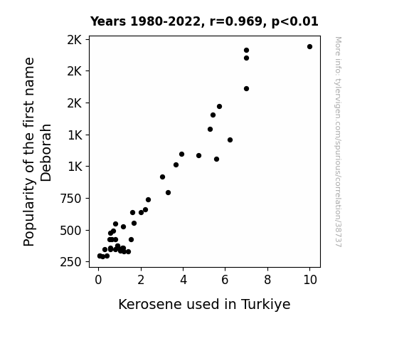 This means 94% of the change in the one variable (i.e., Kerosene used in Turkiye) is predictable based on the change in the other (i.e., Popularity of the first name Deborah) over the 43 years from 1980 through 2022.