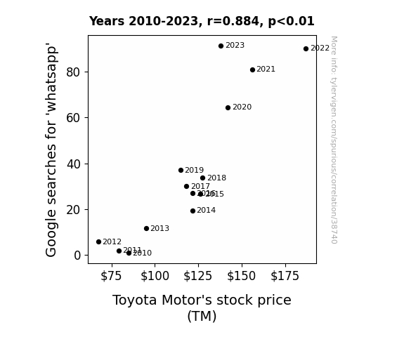This means 78.1% of the change in the one variable (i.e., Toyota Motor's stock price (TM)) is predictable based on the change in the other (i.e., Google searches for 'whatsapp') over the 14 years from 2010 through 2023.