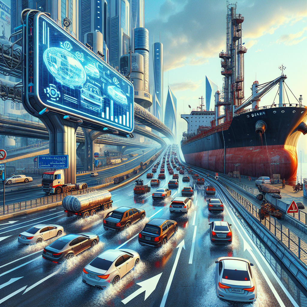 Prompt: Prompt: Generate an image depicting the bustling streets of Bahrain, where cars are sliding on the road due to excess oil residue. A towering digital billboard in the background shows increasing automotive recalls, while oil tankers are seen lining up at the nearby port. The scene should capture the chaos of the street and the contrast between the modern digital billboard and the traditional oil tankers. The focus should be on the cars slipping and skidding on the oil-covered roads, creating a sense of tension and urgency. The depiction should include only scenes, people, and objects, it should not include text or speech bubbles.