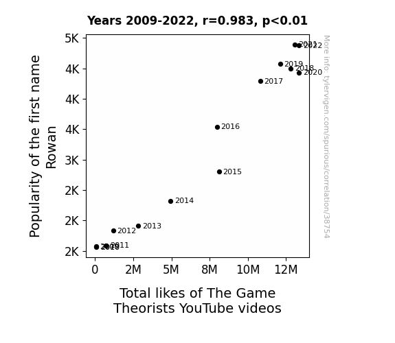 This means 96.6% of the change in the one variable (i.e., Total likes of The Game Theorists YouTube videos) is predictable based on the change in the other (i.e., Popularity of the first name Rowan) over the 14 years from 2009 through 2022.