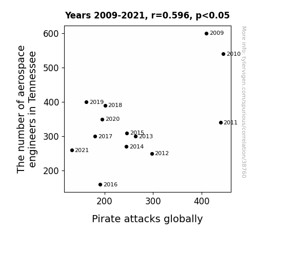 This means 35.5% of the change in the one variable (i.e., Pirate attacks globally) is predictable based on the change in the other (i.e., The number of aerospace engineers in Tennessee) over the 13 years from 2009 through 2021.