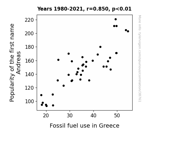 This means 72.3% of the change in the one variable (i.e., Fossil fuel use in Greece) is predictable based on the change in the other (i.e., Popularity of the first name Andreas) over the 42 years from 1980 through 2021.