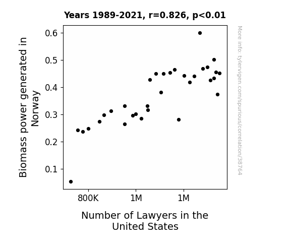 This means 68.2% of the change in the one variable (i.e., Number of Lawyers in the United States) is predictable based on the change in the other (i.e., Biomass power generated in Norway) over the 33 years from 1989 through 2021.