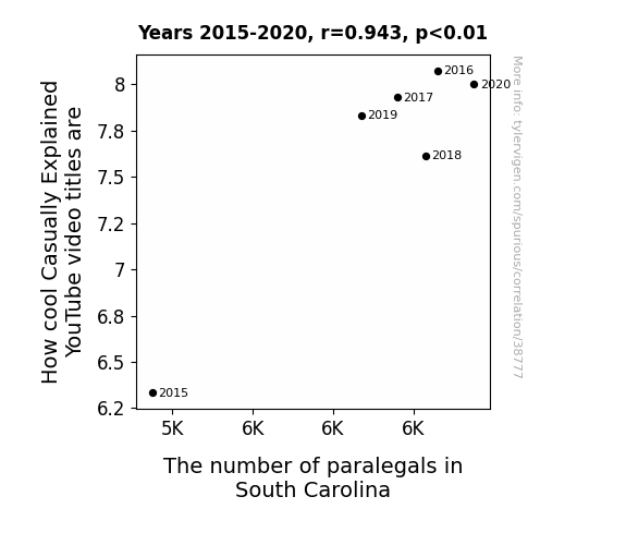 This means 88.9% of the change in the one variable (i.e., The number of paralegals in South Carolina) is predictable based on the change in the other (i.e., How cool Casually Explained YouTube video titles are) over the 6 years from 2015 through 2020.