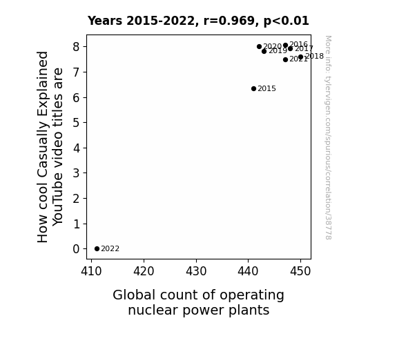 This means 94% of the change in the one variable (i.e., Global count of operating nuclear power plants) is predictable based on the change in the other (i.e., How cool Casually Explained YouTube video titles are) over the 8 years from 2015 through 2022.