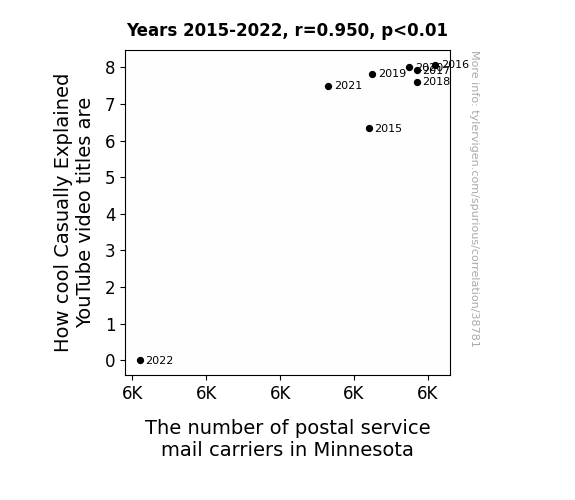 This means 90.2% of the change in the one variable (i.e., The number of postal service mail carriers in Minnesota) is predictable based on the change in the other (i.e., How cool Casually Explained YouTube video titles are) over the 8 years from 2015 through 2022.
