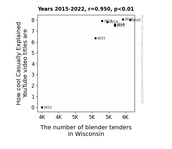 This means 90.3% of the change in the one variable (i.e., The number of blender tenders in Wisconsin) is predictable based on the change in the other (i.e., How cool Casually Explained YouTube video titles are) over the 8 years from 2015 through 2022.