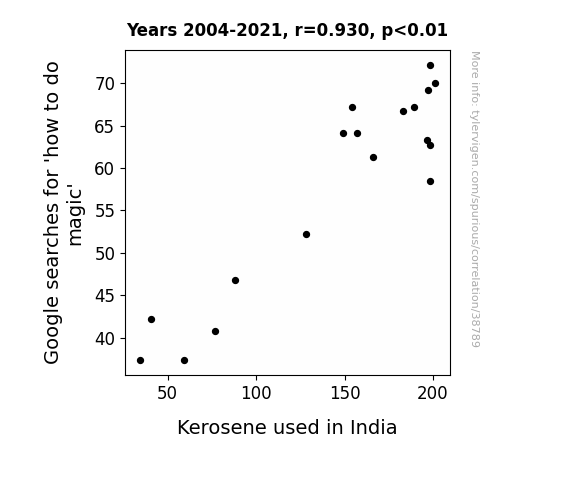 This means 86.4% of the change in the one variable (i.e., Kerosene used in India) is predictable based on the change in the other (i.e., Google searches for 'how to do magic') over the 18 years from 2004 through 2021.