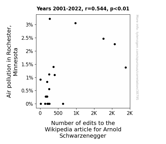 This means 29.6% of the change in the one variable (i.e., Number of edits to the Wikipedia article for Arnold Schwarzenegger) is predictable based on the change in the other (i.e., Air pollution in Rochester, Minnesota) over the 22 years from 2001 through 2022.