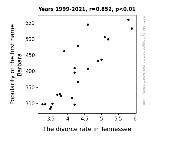 This means 72.6% of the change in the one variable (i.e., The divorce rate in Tennessee) is predictable based on the change in the other (i.e., Popularity of the first name Barbara) over the 23 years from 1999 through 2021.