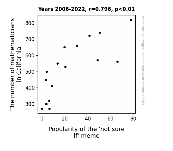 This means 63.3% of the change in the one variable (i.e., Popularity of the 'not sure if' meme) is predictable based on the change in the other (i.e., The number of mathematicians in California) over the 17 years from 2006 through 2022.
