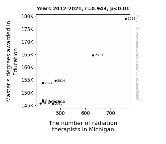 This means 88.9% of the change in the one variable (i.e., The number of radiation therapists in Michigan) is predictable based on the change in the other (i.e., Master's degrees awarded in Education) over the 10 years from 2012 through 2021.