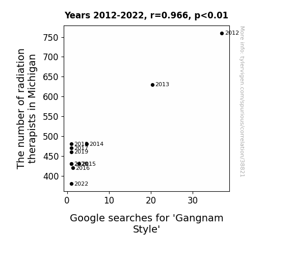 This means 93.3% of the change in the one variable (i.e., Google searches for 'Gangnam Style') is predictable based on the change in the other (i.e., The number of radiation therapists in Michigan) over the 11 years from 2012 through 2022.