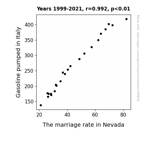This means 98.4% of the change in the one variable (i.e., The marriage rate in Nevada) is predictable based on the change in the other (i.e., Gasoline pumped in Italy) over the 23 years from 1999 through 2021.