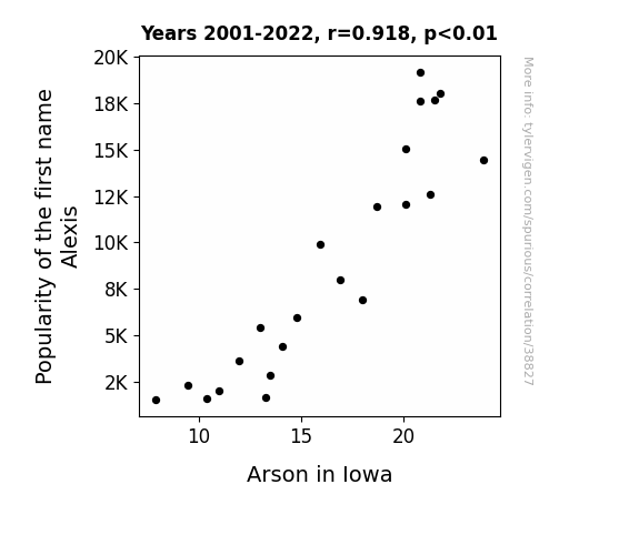 This means 84.3% of the change in the one variable (i.e., Arson in Iowa) is predictable based on the change in the other (i.e., Popularity of the first name Alexis) over the 22 years from 2001 through 2022.