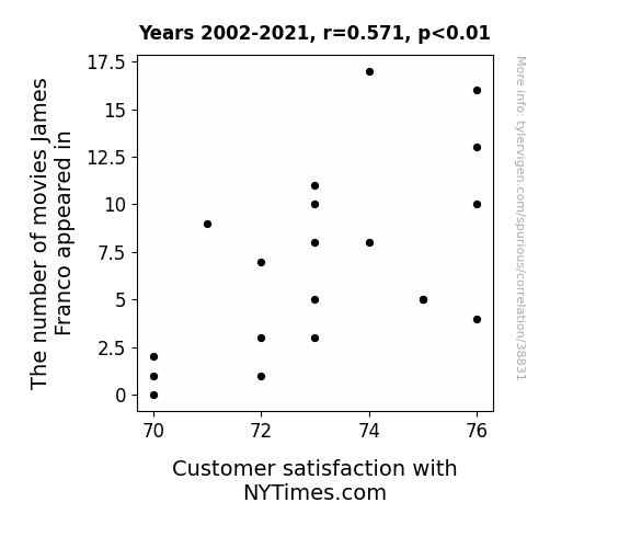 This means 32.6% of the change in the one variable (i.e., Customer satisfaction with NYTimes.com) is predictable based on the change in the other (i.e., The number of movies James Franco appeared in) over the 20 years from 2002 through 2021.