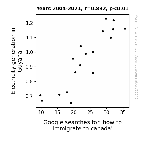This means 79.5% of the change in the one variable (i.e., Google searches for 'how to immigrate to canada') is predictable based on the change in the other (i.e., Electricity generation in Guyana) over the 18 years from 2004 through 2021.