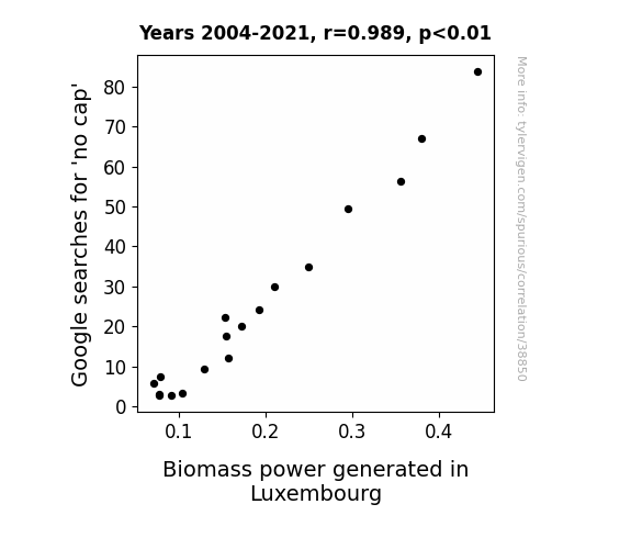 This means 97.9% of the change in the one variable (i.e., Biomass power generated in Luxembourg) is predictable based on the change in the other (i.e., Google searches for 'no cap') over the 18 years from 2004 through 2021.