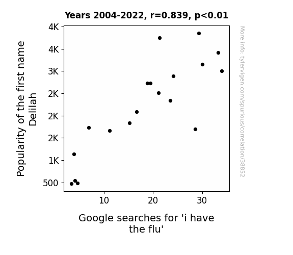 This means 70.5% of the change in the one variable (i.e., Google searches for 'i have the flu') is predictable based on the change in the other (i.e., Popularity of the first name Delilah) over the 19 years from 2004 through 2022.