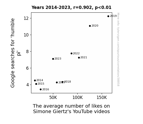 This means 81.4% of the change in the one variable (i.e., The average number of likes on Simone Giertz's YouTube videos) is predictable based on the change in the other (i.e., Google searches for 'humble pi') over the 10 years from 2014 through 2023.