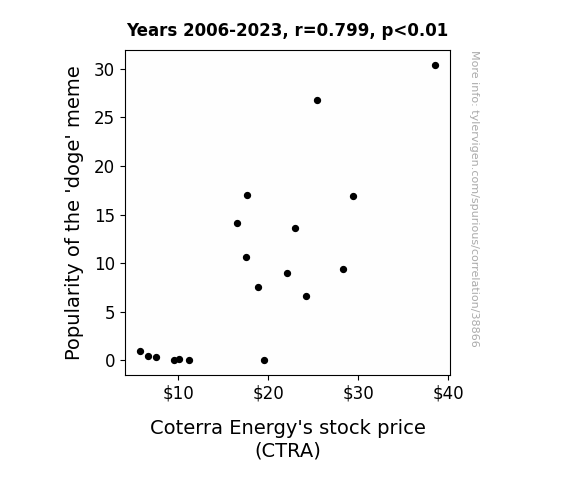 This means 63.8% of the change in the one variable (i.e., Coterra Energy's stock price (CTRA)) is predictable based on the change in the other (i.e., Popularity of the 'doge' meme) over the 18 years from 2006 through 2023.