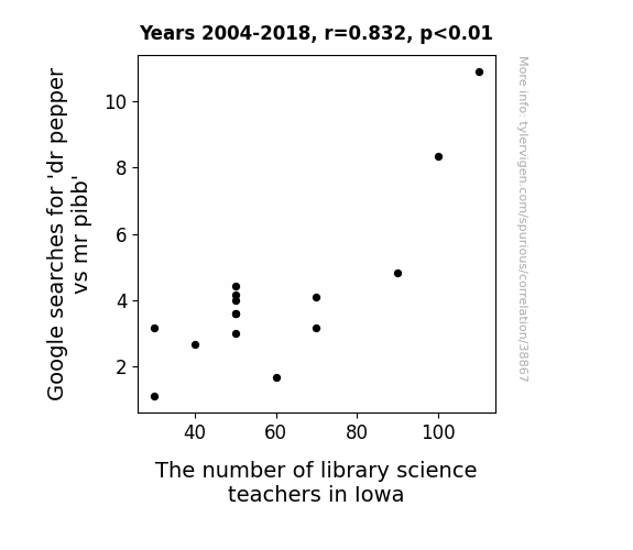 This means 69.3% of the change in the one variable (i.e., The number of library science teachers in Iowa) is predictable based on the change in the other (i.e., Google searches for 'dr pepper vs mr pibb') over the 15 years from 2004 through 2018.