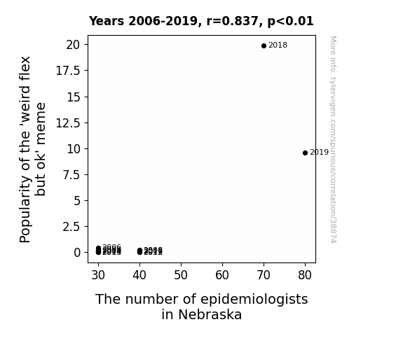 This means 70.1% of the change in the one variable (i.e., The number of epidemiologists in Nebraska) is predictable based on the change in the other (i.e., Popularity of the 'weird flex but ok' meme) over the 14 years from 2006 through 2019.