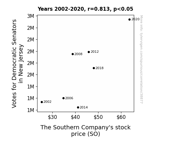 This means 66.1% of the change in the one variable (i.e., The Southern Company's stock price (SO)) is predictable based on the change in the other (i.e., Votes for Democratic Senators in New Jersey) over the 7 years from 2002 through 2020.
