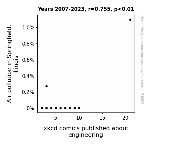 This means 56.9% of the change in the one variable (i.e., xkcd comics published about engineering) is predictable based on the change in the other (i.e., Air pollution in Springfield, Illinois) over the 17 years from 2007 through 2023.