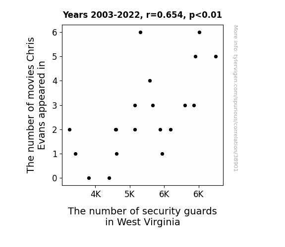 This means 42.8% of the change in the one variable (i.e., The number of security guards in West Virginia) is predictable based on the change in the other (i.e., The number of movies Chris Evans appeared in) over the 20 years from 2003 through 2022.