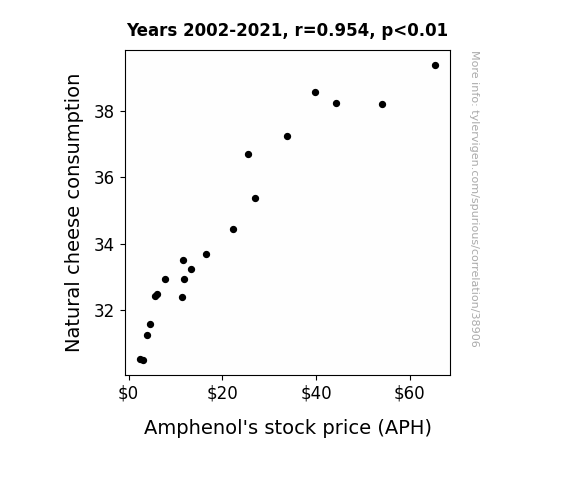 This means 91% of the change in the one variable (i.e., Amphenol's stock price (APH)) is predictable based on the change in the other (i.e., Natural cheese consumption) over the 20 years from 2002 through 2021.