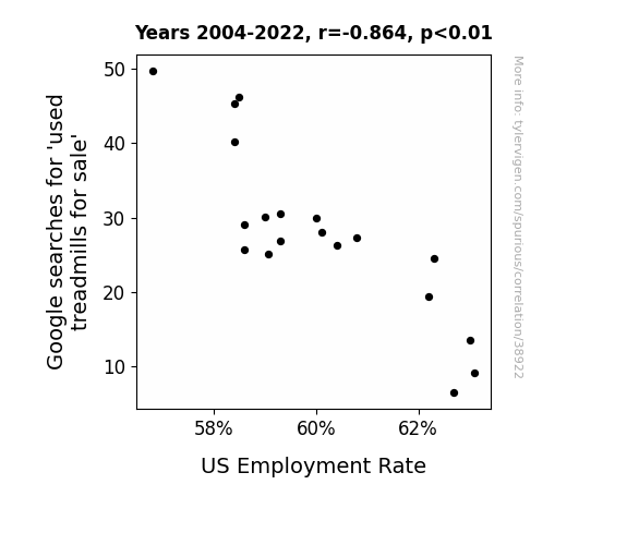 This means 74.7% of the change in the one variable (i.e., US Employment Rate) is predictable based on the change in the other (i.e., Google searches for 'used treadmills for sale') over the 19 years from 2004 through 2022.