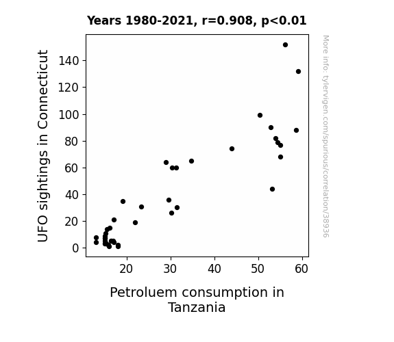 This means 82.5% of the change in the one variable (i.e., Petroluem consumption in Tanzania) is predictable based on the change in the other (i.e., UFO sightings in Connecticut) over the 42 years from 1980 through 2021.