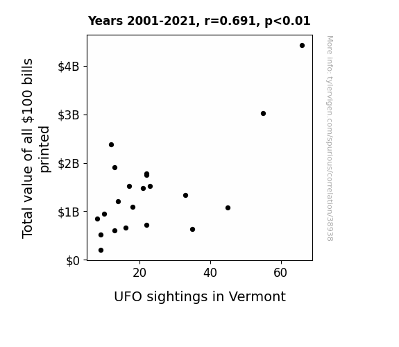 This means 47.8% of the change in the one variable (i.e., UFO sightings in Vermont) is predictable based on the change in the other (i.e., Total value of all $100 bills printed) over the 21 years from 2001 through 2021.