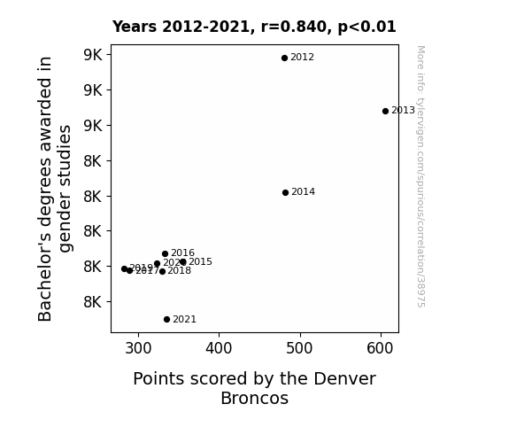 This means 70.5% of the change in the one variable (i.e., Points scored by the Denver Broncos) is predictable based on the change in the other (i.e., Bachelor's degrees awarded in gender studies) over the 10 years from 2012 through 2021.