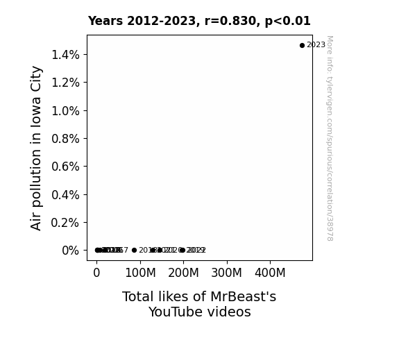 This means 68.9% of the change in the one variable (i.e., Total likes of MrBeast's YouTube videos) is predictable based on the change in the other (i.e., Air pollution in Iowa City) over the 12 years from 2012 through 2023.