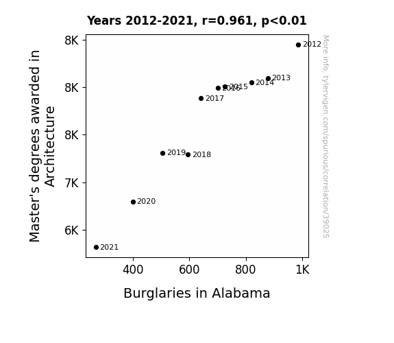 This means 92.4% of the change in the one variable (i.e., Burglaries in Alabama) is predictable based on the change in the other (i.e., Master's degrees awarded in Architecture) over the 10 years from 2012 through 2021.