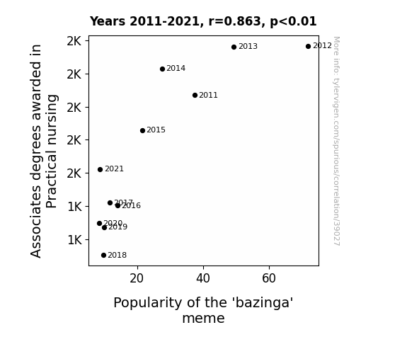 This means 74.5% of the change in the one variable (i.e., Popularity of the 'bazinga' meme) is predictable based on the change in the other (i.e., Associates degrees awarded in Practical nursing) over the 11 years from 2011 through 2021.