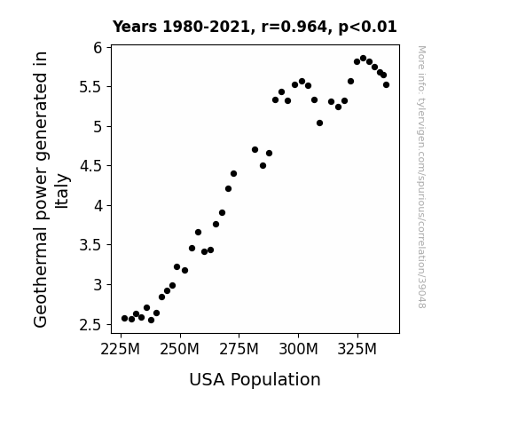 This means 92.9% of the change in the one variable (i.e., USA Population) is predictable based on the change in the other (i.e., Geothermal power generated in Italy) over the 42 years from 1980 through 2021.