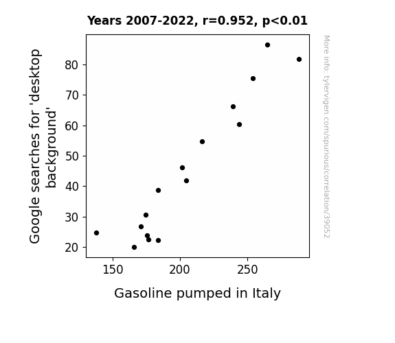 This means 90.7% of the change in the one variable (i.e., Gasoline pumped in Italy) is predictable based on the change in the other (i.e., Google searches for 'desktop background') over the 16 years from 2007 through 2022.