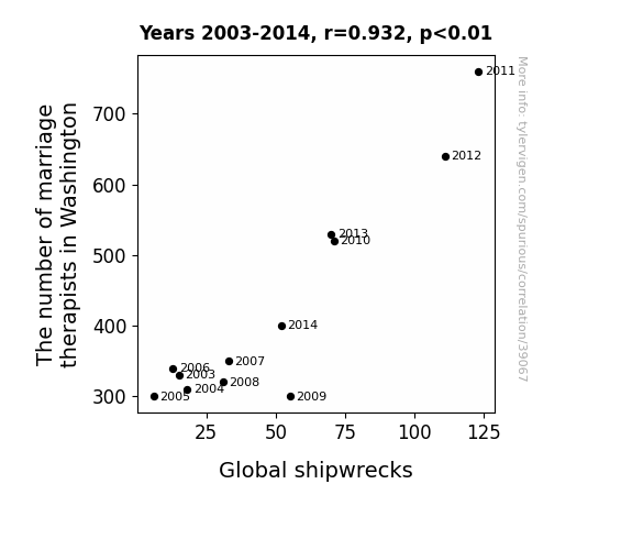 This means 86.8% of the change in the one variable (i.e., Global shipwrecks ) is predictable based on the change in the other (i.e., The number of marriage therapists in Washington) over the 12 years from 2003 through 2014.