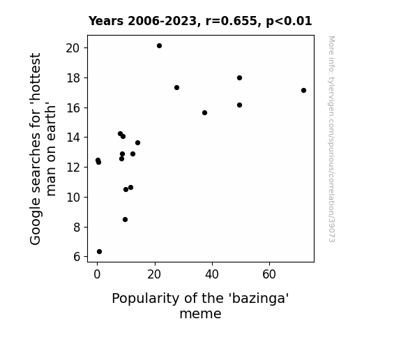 This means 43% of the change in the one variable (i.e., Popularity of the 'bazinga' meme) is predictable based on the change in the other (i.e., Google searches for 'hottest man on earth') over the 18 years from 2006 through 2023.