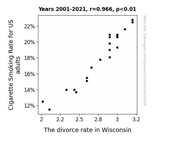 This means 93.3% of the change in the one variable (i.e., The divorce rate in Wisconsin) is predictable based on the change in the other (i.e., Cigarette Smoking Rate for US adults) over the 21 years from 2001 through 2021.