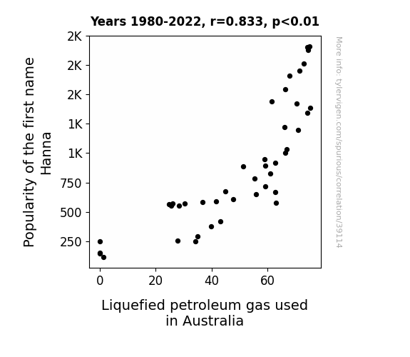 This means 69.5% of the change in the one variable (i.e., Liquefied petroleum gas used in Australia) is predictable based on the change in the other (i.e., Popularity of the first name Hanna) over the 43 years from 1980 through 2022.